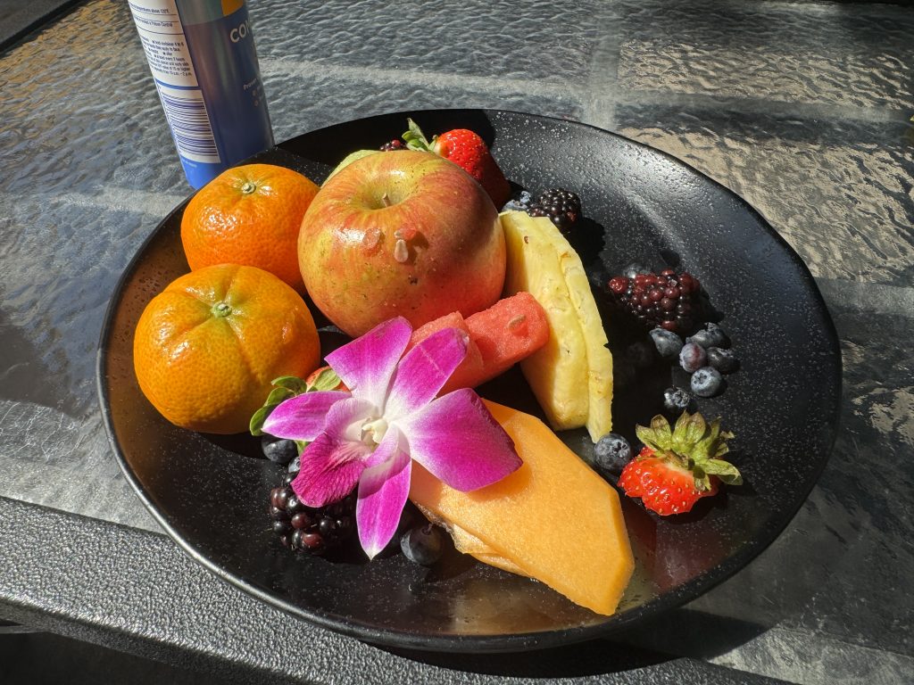 The cabana rentals are a little pricey, but in my opinion totally worth it. The Disneyland Hotel pool features two water slides that are styled after the monorail. One is pretty easy going and the other is a little faster, but both are manageable for a lot of ages. The cabanas themselves are at the far end of the pool and feature a shaded area with a tv, refrigerator, couches, and a couple of lounges. They also provide you with free waters, a plate of fruit (my daughter just loved the orchid adorning it), peppermint scented cool washcloths for cooling off, and a server that can bring you food and drinks from a specialized poolside menu. Word to the wise, if you order a drink there from Trader Sam’s, there is no option to get the souvenir tiki cup with. Great drinks, but boy was I sad to miss out on the Ursula tiki.